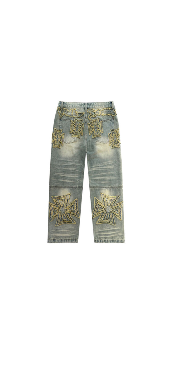 Statement denim from VALABASAS featuring heavy vintage wash treatment and oversized gothic cross embroidery throughout the front and back. Designed with a relaxed straight / stacked streetwear fit, the jeans combine distressed fading, whiskering details, and contrast drawstring waist accents for a modern underground aesthetic. Large tonal cross appliqués add texture and depth, making this a standout designer-inspired denim piece suited for statement outfits.