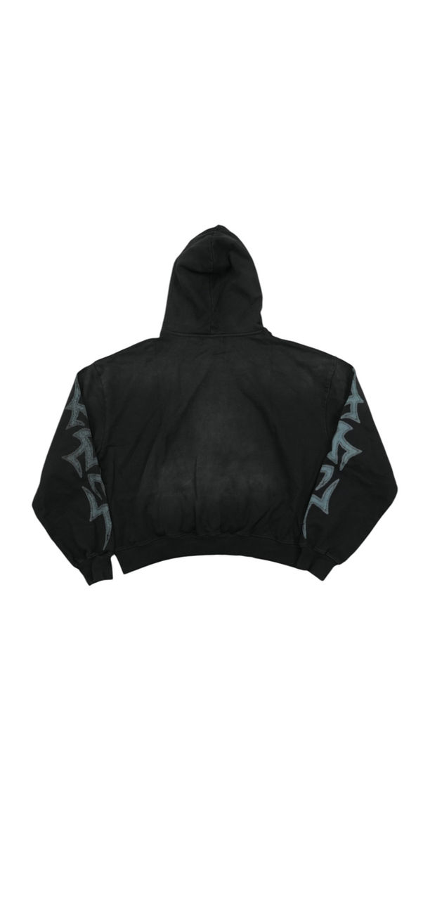 Dark-toned Vale hoodie featuring a storm-charged figure graphic with electrified detailing and gothic “Vale” branding across the chest. Finished with matching sleeve graphics and a washed black base for a worn-in, underground feel.