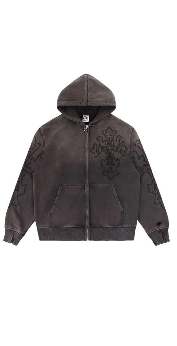 The VALE Washed Cross Zip Hoodie features a heavily faded vintage wash combined with signature tonal cross graphics throughout the garment. Designed with a cropped boxy streetwear silhouette, this full-zip hoodie delivers a worn-in aesthetic while maintaining structure and weight.